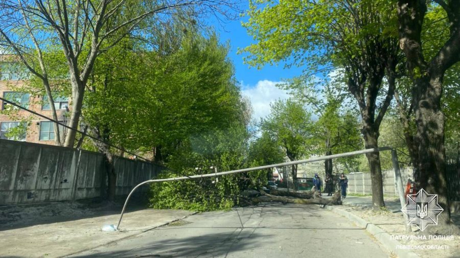 За даними патрульної поліції Львівщини, вулицю Дашкевича (Шевченківський район) краще оминати. Тут впало відразу два дерева, пошкодивши опору лінії електропередач.