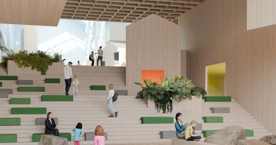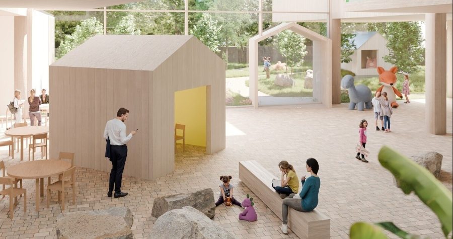 Новий медзаклад зведуть за принципом «село у будівлі» — простір буде організований як невелике містечко з садами, зонами для відновлення, гри та підтримки сімей.