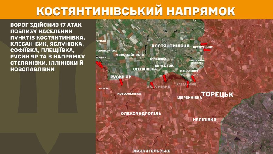 На Костянтинівському напрямку противник здійснив 17 атак поблизу населених пунктів Костянтинівка, Клебан-Бик, Яблунівка, Софіївка, Плещіївка, Русин Яр та в напрямку Степанівки, Іллінівки й Новопавлівки.