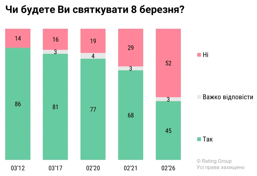Станом на кінець лютого 2026 року лише 45% опитаних планують відзначати 8 березня. При цьому 52% респондентів заявили, що не будуть цього робити.