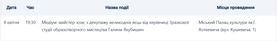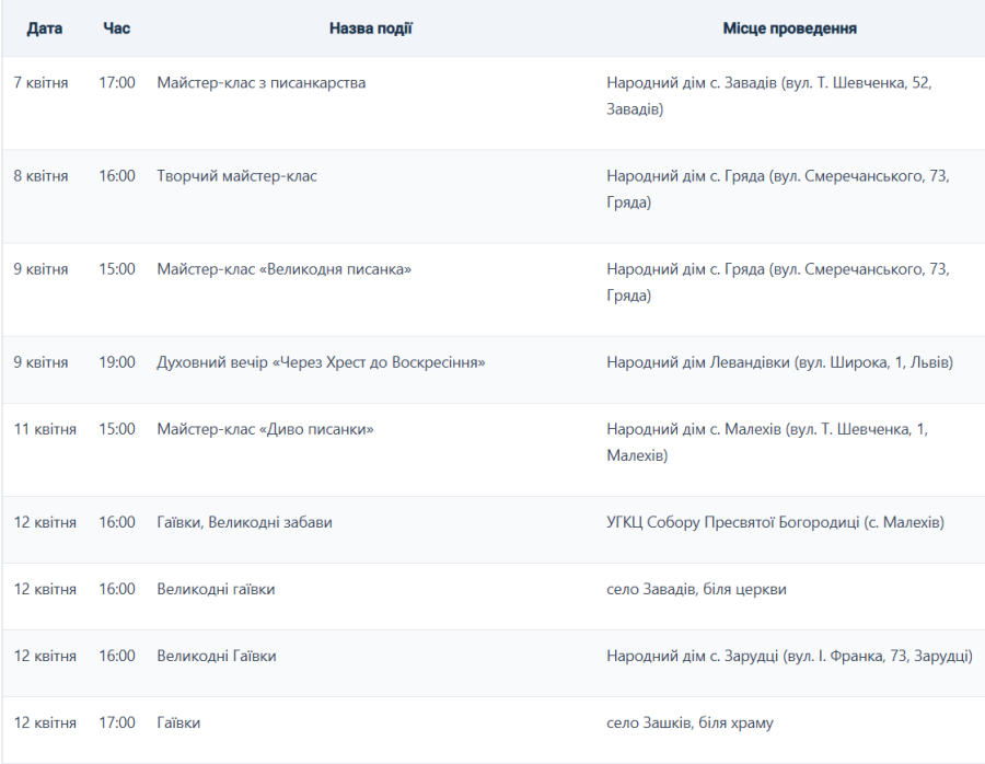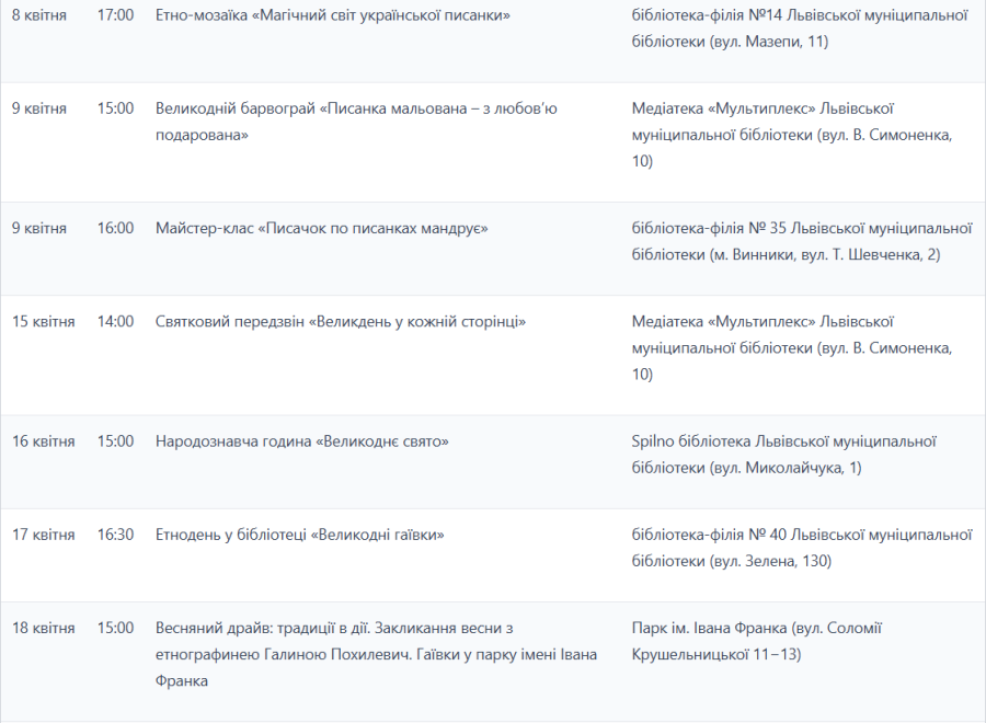 Цьогорічна програма поєднує традиційні великодні звичаї з сучасними мистецькими форматами. Відвідувачі зможуть долучитися до майстер-класів із писанкарства та декупажу, а також відвідати гаївки, концерти й театральні постановки.