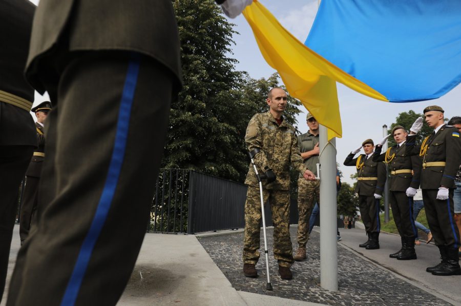 Роман Максимець піднімає прапор України під час урочистостей у Львові 23 серпня 2022 року, фото – Андрій Садовий/Facebook