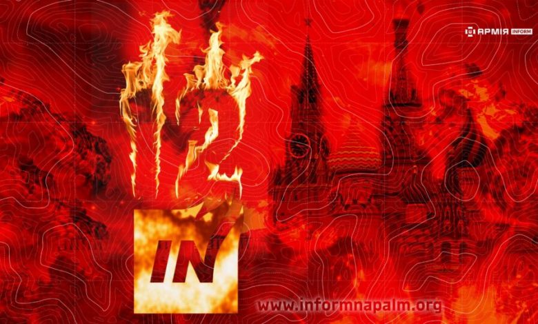 Мінімалістичний варіант: на помаранчевому фоні лише полум’яна цифра «12» без додаткових елементів у центрі. Внизу розміщено невеликий логотип «IN» і адресу сайту informnapalm.org.