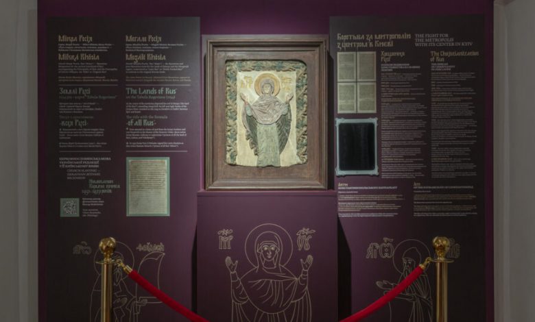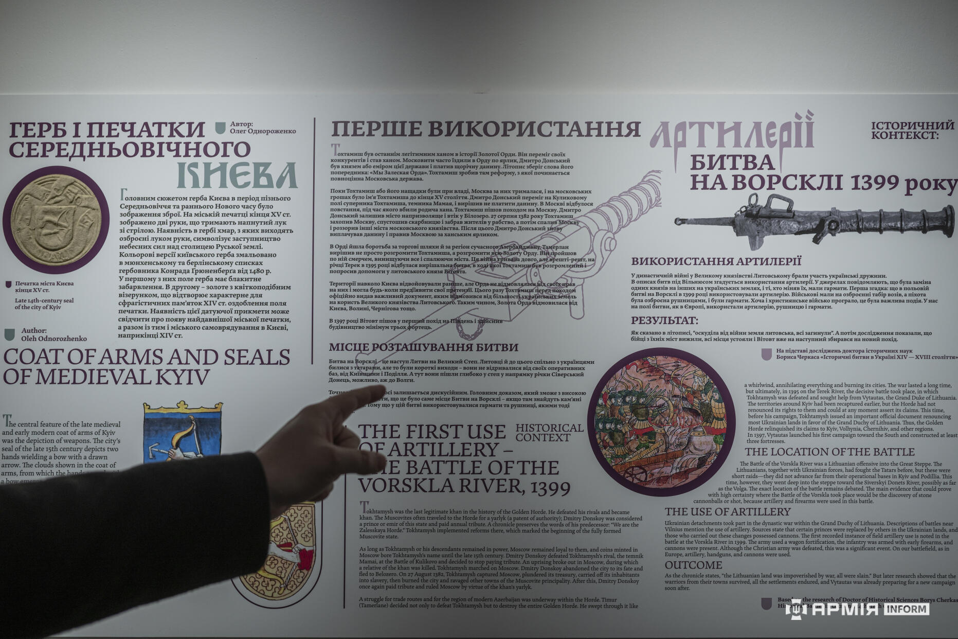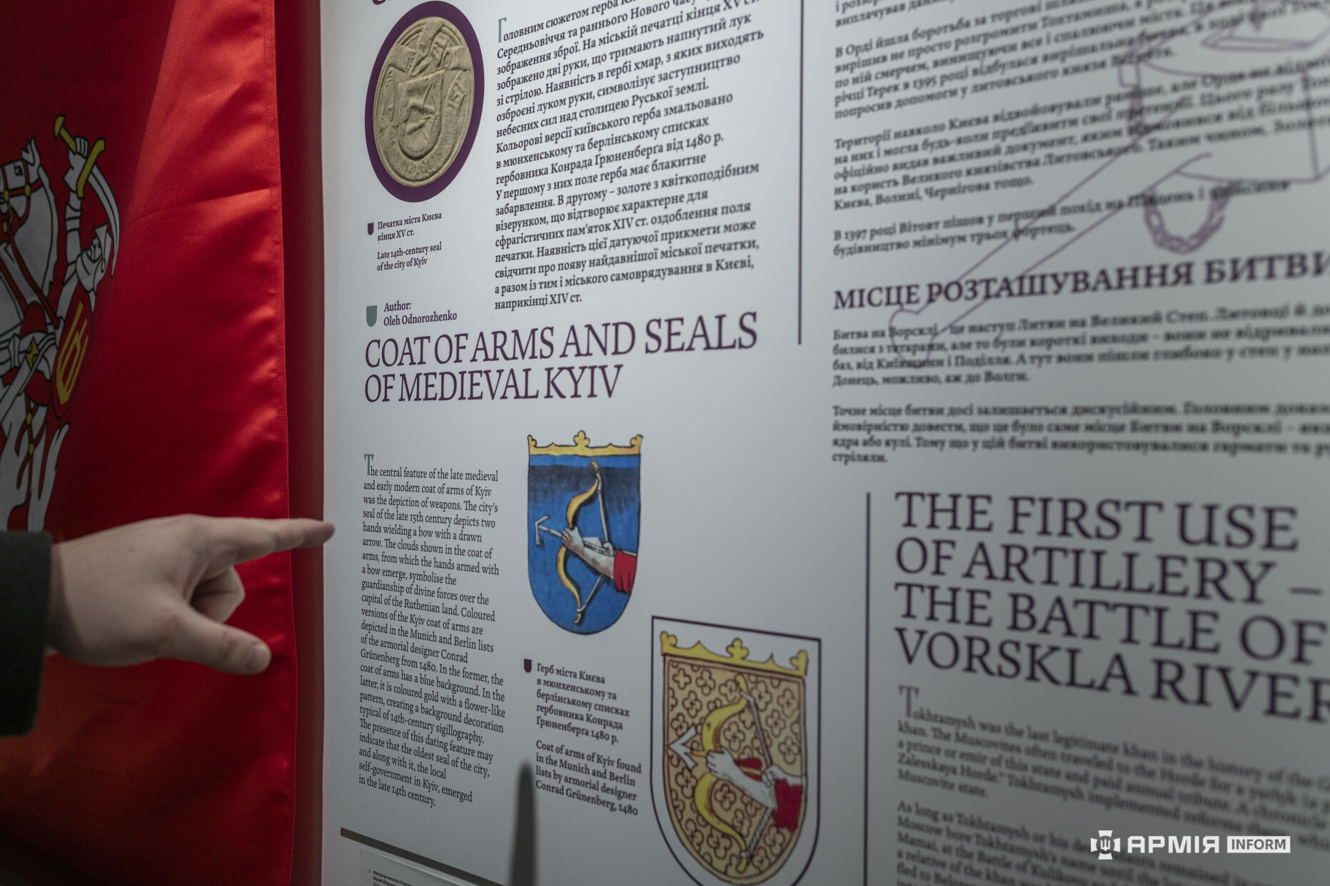 Експозиція робить це через автентичні свідчення доби — документи, включно з актами Константинопольського патріархату з 1317 року, які пов’язані з боротьбою за Київську та інші митрополії, документи з Держархіву Швеції, Державного архіву Литви і Державної архівної служби України (доступні для перегляду на проекторі), печатки, монети, карти, зброю і хоругви полків. Представлені матеріали ілюструють відновлення Київської митрополії, участь полків з українських земель у вирішальних битвах доби, а також трансформацію Київського князівства у Київське воєводство і народження української незламності в 1471 році.