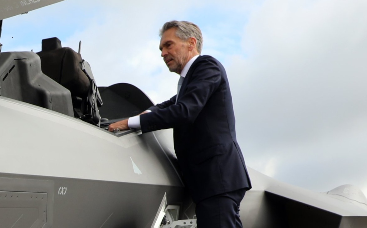 Дік Схооф оглядає винищувач F-35. На борту літака нанесена позначка за збитий дрон. Фото – x.com/MinPres