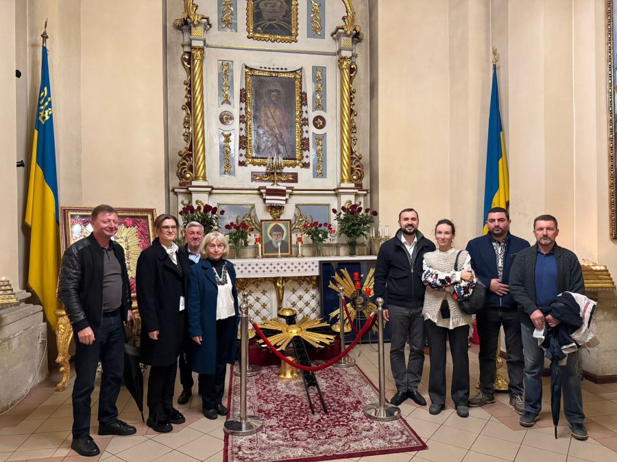 Реставратори та представники Львівської міської ради біля відреставрованого та освяченого сьогодні хреста з куполу Собору Святого Юра у Львові, 1 жовтня 2025 року. Фото: Євген Бойко