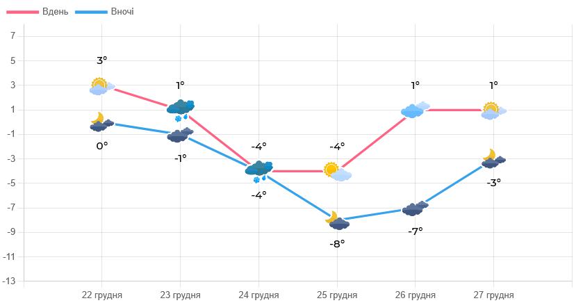 За даними Львівського гідрометцентру, похолодання прийде вже у вівторок, 23 грудня. Вночі температура повітря становитиме від 3 градусів морозу до 2 градусів тепла. Вдень стовпчик термометра коливатиметься від -1°С до +4°С.