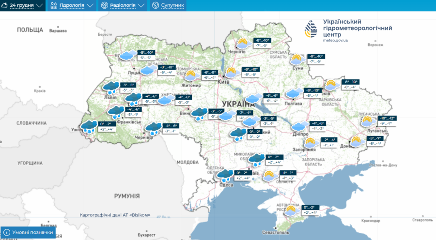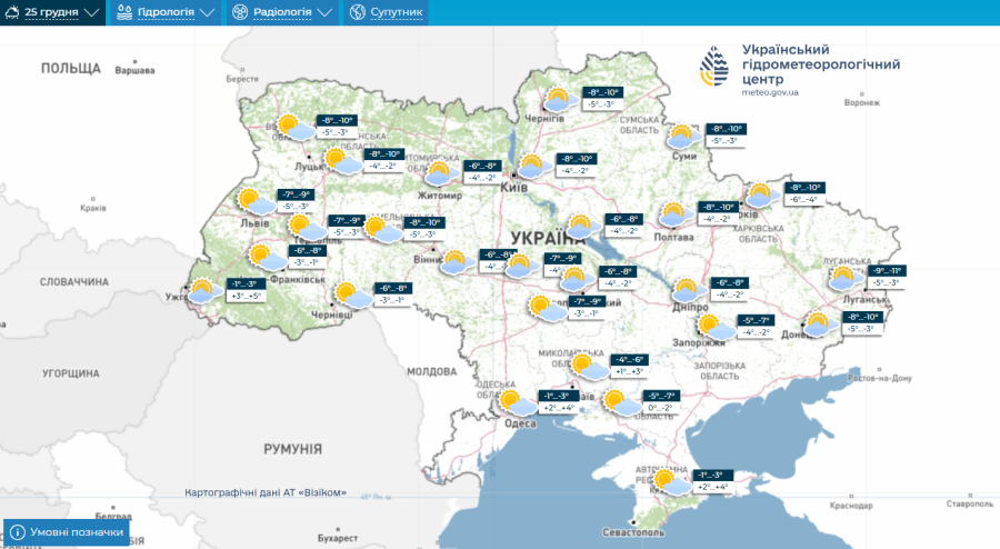 На Різдво вигляне сонечко, опадів попередньо не прогнозують. Вночі стовпчик термометра опуститься до 7-9 градусів морозу, а вдень – до 3-5 градусів морозу. Вітер східний, 5-10 м/с.