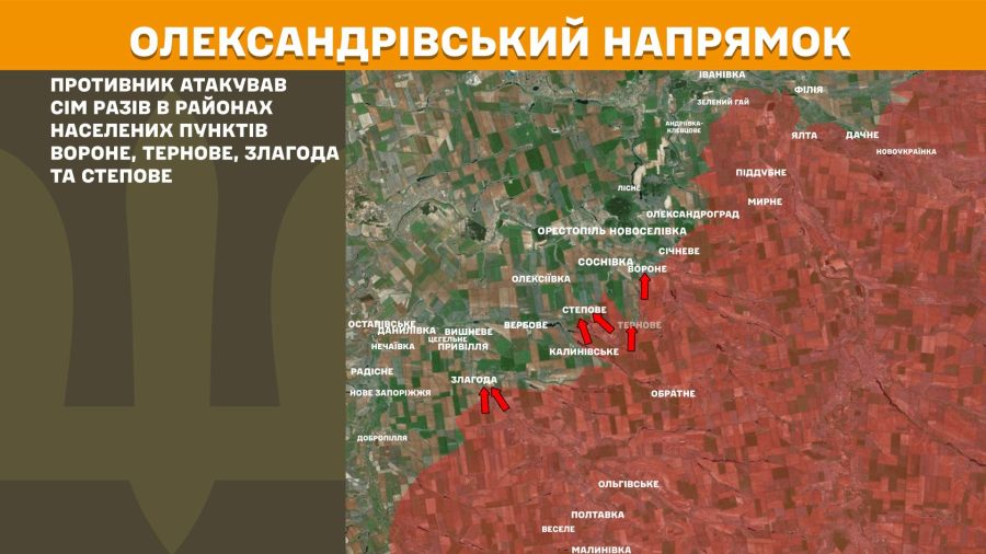 На Олександрівському напрямку противник атакував сім разів в районах населених пунктів Вороне, Тернове, Злагода та Степове.