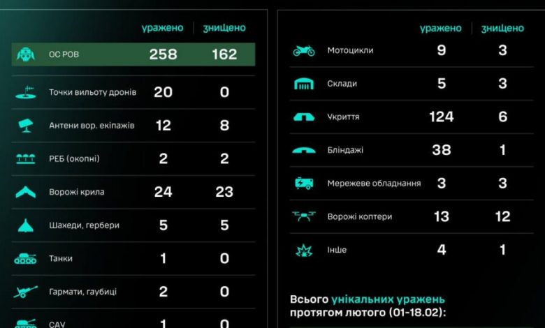 Загалом упродовж лютого (01–18.02) знищено/уражено 16 789 цілей, з них — 5260 особовий склад противника.