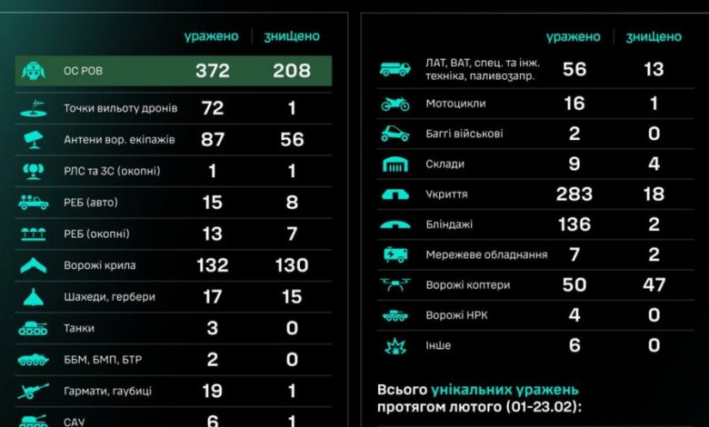Загалом упродовж лютого (01–23.02) знищено/уражено 22 152 цілі, з них 6766 — особовий склад противника.