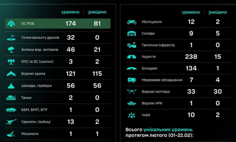 Загалом упродовж лютого (01–22.02) знищено/уражено 20 841 цілей, з них 6394 — особовий склад противника.