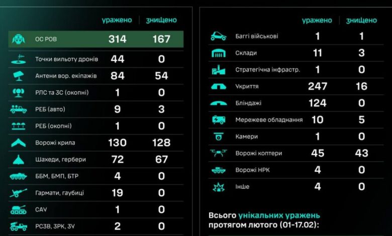 Загалом упродовж лютого (01–17.02) знищено/уражено 16 256 цілей, з них 5002 — особовий склад противника.