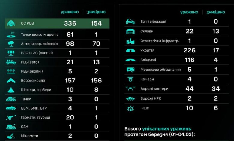 Загалом упродовж березня (01–04.03) уражено/знищено 5122 цілі, з них 1299 — особовий склад противника.
