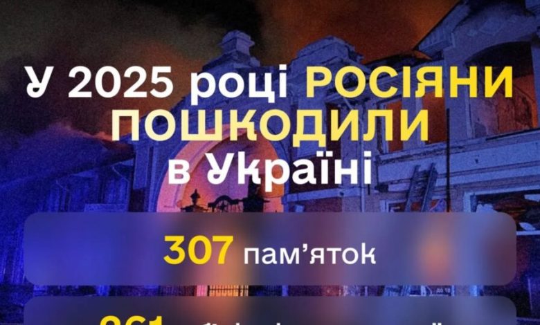 У 2025 році унаслідок російської агресії в Україні зруйновано та пошкоджено 307 пам’яток культурної спадщини та 261 об’єкт культурної інфраструктури.