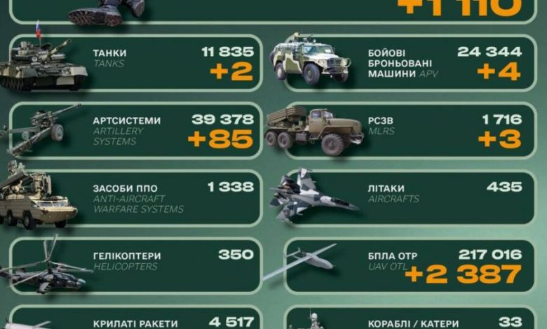 За минулу добу ворог втратив 1 110 військових, три танки та 85 артсистем