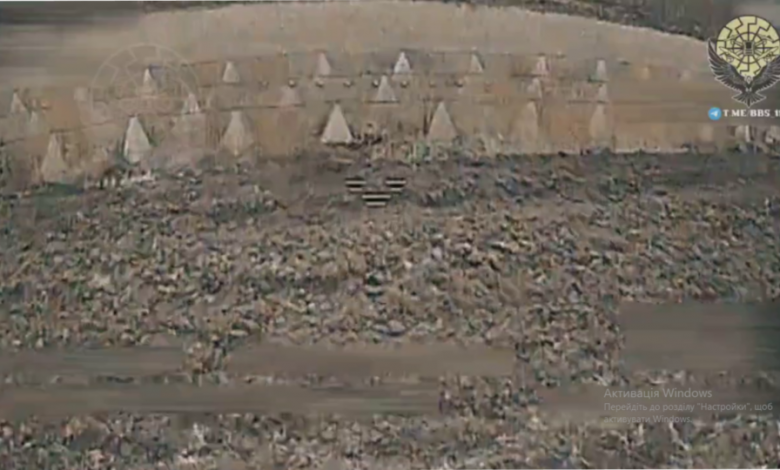 Бійці батальйону безпілотних систем 110-ї механізованої бригади імені генерал-хорунжого Марка Безручка знищили ворожого піхотинця, який заплутався у колючому дроті між бетонних пірамід.