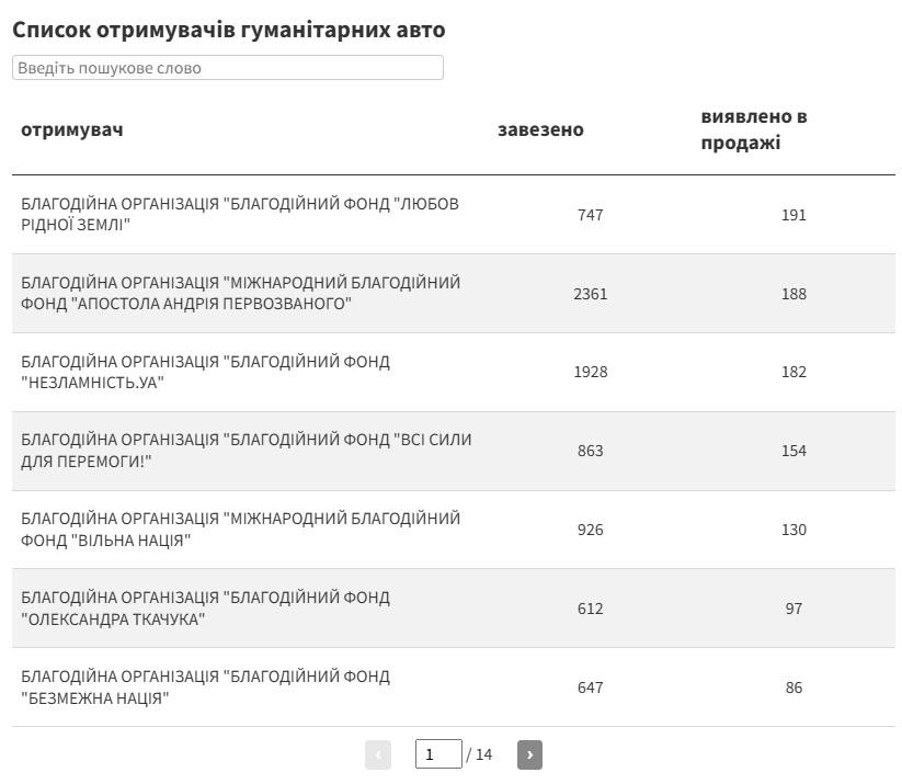 Зазначається, що на першому місці – понад 190 виявлених в продажу автомобілів – опинилась київська благодійна організація «БФ “Любов Рідної Землі”». До списку лідерів з виявлених у продажу на Auto.Ria гуманітарних автомобілів потрапили також київський МБФ «Апостола Андрія Первозванного» (188 авто), рівненський благодійний фонд «Незламність.УА» (182 авто), київський фонд «Всі сили для перемоги!» (154 авто) та вінницька «Вільна нація» (130 авто).