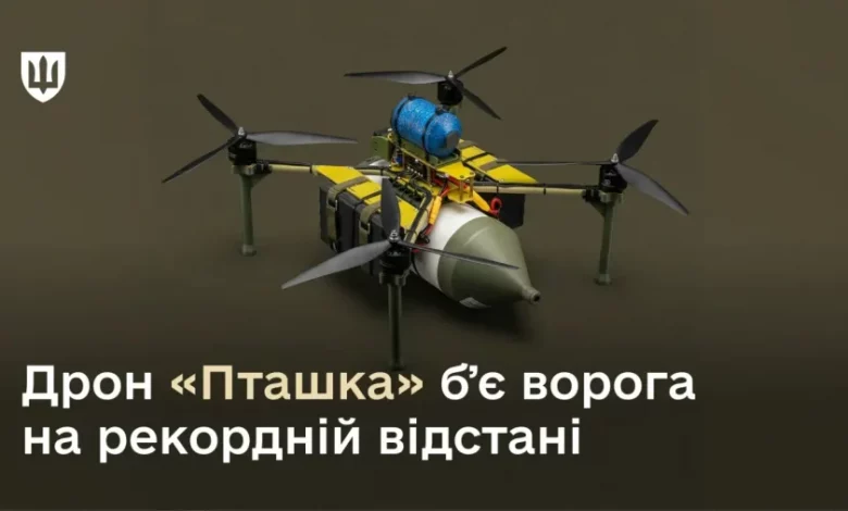 Йдеться про ударний квадрокоптер «Пташка» українського виробництва. Він має оптоволоконний канал управління і може виконувати бойові завдання на глибині майже 50 км. Наразі це рекордний показник серед усіх зразків безпілотників такого типу, кодифікованих Міністерством оборони.